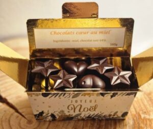 Ballotin de 16 chocolats noirs (65%) fourrés au miel de fleurs, élaboré localement avec le miel de Saint-